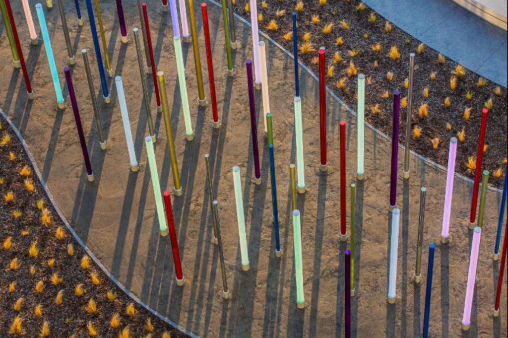 Featuring 57 colorful, powder-coated steel poles and 23 LED poles, Forest of Light is a sculptural installation created by Dallas artists Frances Bagley and Tom Orr.